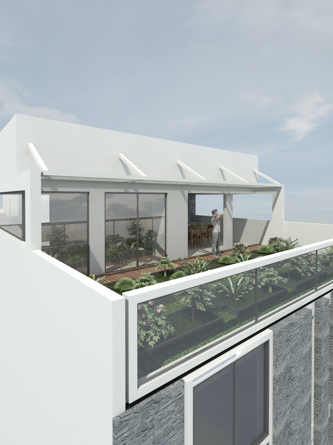 Diseñado estratégicamente en un espacio entre medianeras, este condominio cuenta con una losa de fundación para vehículos, cuatro niveles de departamentos y un quinto nivel con áreas comunes y jardines en la cubierta. Nuestro enfoque principal es brindar hogares funcionales y modernos, diseñados pensando en las necesidades de los residentes.